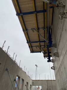 I dag foretages den 1. støbning fra vores klatreplatform. Det er væggen i betonkernen på 1. sal som vi støber. Klatreplatformen gør det muligt for os at arbejde sikkert i