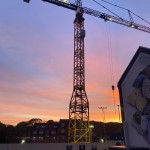 Vi har i øjeblikket besøg af en BMS-kran, som hjælper os med at samle forskallingen til vores klatreforme, de skal anvendes hele vejen op i vores trappekerne. Når først denne